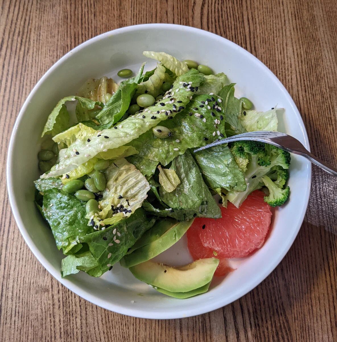 Дома я бы заправила этот салат льняным или кунжутным маслом. В кунжуте много кальция. Бобы эдамаме содержат витамины группы В, фолиевую кислоту и Омега- 3. Главное побольше зелени, рукколу обожаю, сырую капусту брокколи или цветную капусту и конечно авокадо, а целый грейпфрут часто просто съедаю на завтрак.